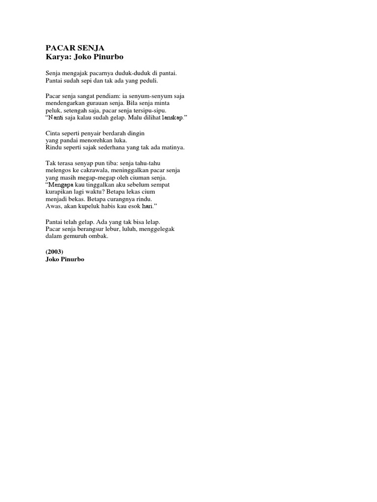 Buku kumpulan puisi ini merupakan buku kumpulan puisi terbaru Joko Pinurbo dan dipublikasikan pula dalam bentuk musikalisasi puisi oleh Oppie Andaresta. Posting Lebih Baru Posting Lama Beranda. Ada juga sajak yang menyindir permasalahan HAM yaitu mengenai hilangnya salah satu aktivis bernama Wiji Thukul.