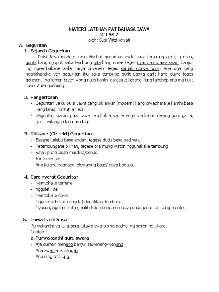 Jan 11 2021 Geguritan utawa guritan iku puisi Jawa gagrag anyar kang ora kaiket dening paugeran kang wis tertamtu. Puisi basa jawa gagrag anyar modern kang ora kaiket dening paugeran aturan sing gumathok. Latihan Bahasa Jawa Bab 1 GEGURUTAN CICIK DRAFT.