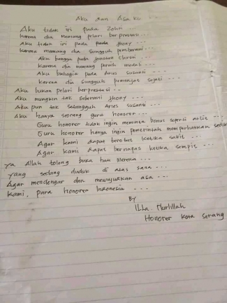 Atik yang menjadi pengajar di SDN 02 Cawet Pemalang sengaja membuat puisi tersebut karena merasa cemas dengan kondisi honorer. RABU 5 OKTOBER 2016. Buktinya ketika ada uji kompetensi guru secara online nilai rata-rata GTT selalu di atas guru ASN.