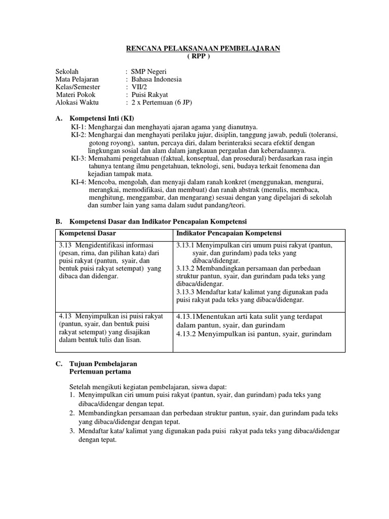 Rpp Kd 3 9 Dan Kd 4 9 Puisi Rakyat