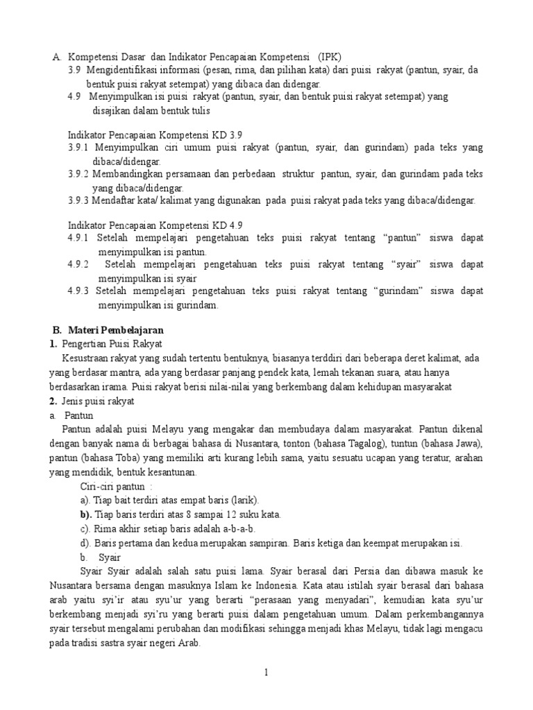 1 dan 2 b. Dapat dibuat indikator lain bagian a 3 9 mengidentiikasi informasi pesan rima dan pilihan kata dari puisi rakyat pantun syair dan bentuk puisi rakyat setempat yang dibaca dan didengar. Kesusastraan lama kaya akan muatan nilai moral agama dan budi pekerti yang telah diarungi oleh nenek moyang kita.