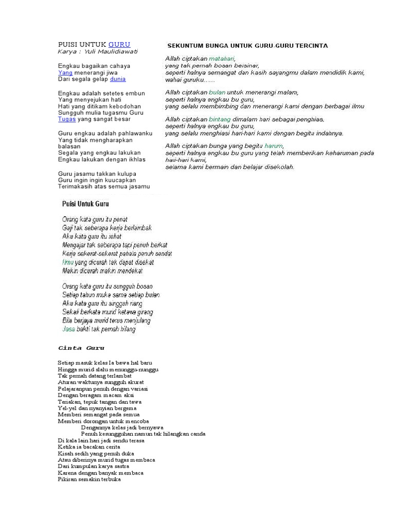 Karena alam mampu memberikan apa yang kita butuhkan sehari-hari. Macam- macam Puisi Lama. Kita sebagai anak yang berbakti kepada orang tua sudah sepatutnya membalas jasa-jasa beliau yang telah dilakukan salah satunya bisa dengan memberikan puisi kepadanya untuk mengenang kembali apa yang telah diperbuat untuk kesuksesan anaknya.