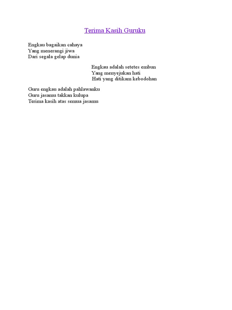 Engkaulah ibu kedua kami kau habiskan setengah hari hanya untuk mendidik kami. Tiap baris terdiri atas 812 suku kata. Indonesia Sekolah Menengah Atas Bacalah kembali puisi guruku engkaulah cahaya B Berapa banyak baris pada bait kedua.