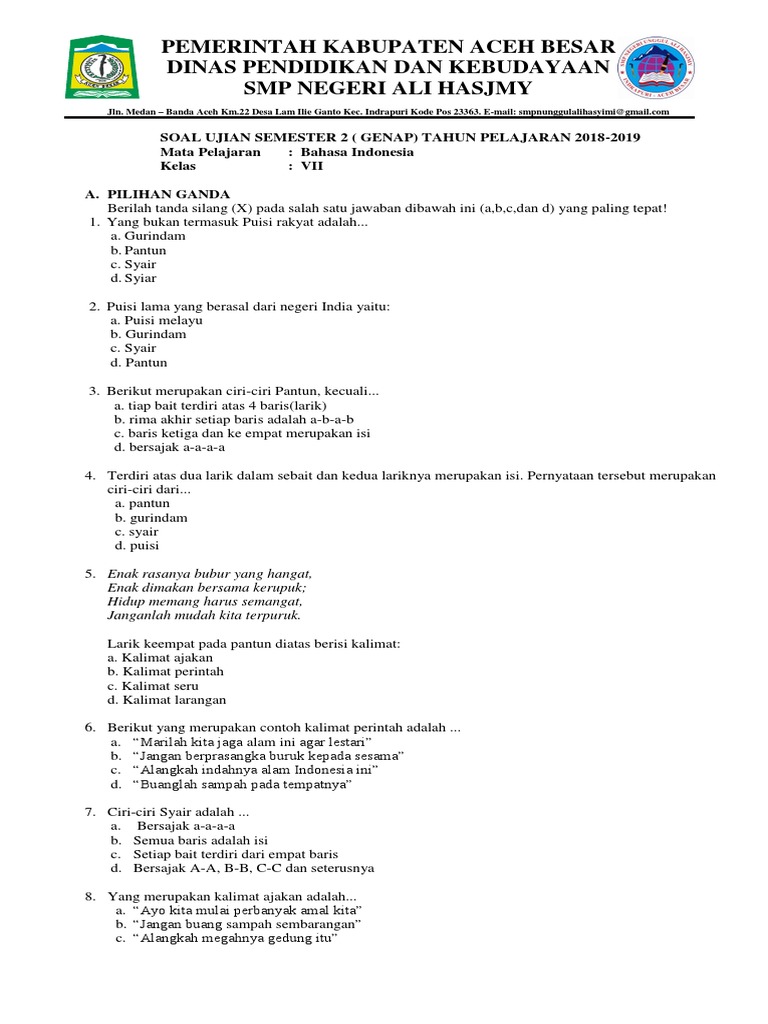 Terdiri dari dua baris dalam sebait. Mengenal dan Memahami Puisi Rakyat Jenis-jenis Puisi Rakyat Bahasa dalam Puisi Rakyat Menulis Puisi Rakyat Tema 2 Cerita Fabel. Apr 28 2019 40 Contoh Soal PG Bahasa Indonesia Kelas 7 Semester 2 K13 dan Jawabannya - 40 contoh soal pilihan ganda bahasa Indonesia kelas 7 semester 2 kurikulum 2013 K13 beserta kunci jawabannya.