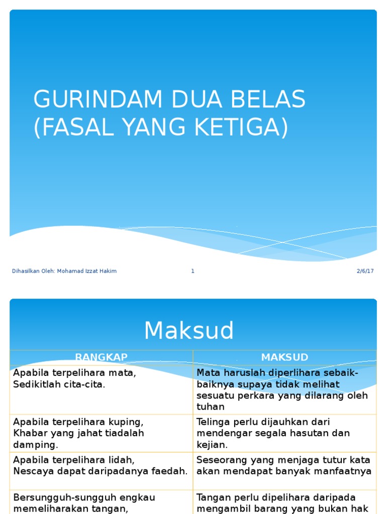 Maksud puisi gurindam dua belas. Ibrahim Nik Nur Syaida Ismalissa Bt. ڬوريندام دوا بلس merupakan gurindam salah satu puisi Melayu lama hasil karya Raja Ali Haji seorang sastrawan dan Pahlawan Nasional dari Pulau Penyengat Provinsi Kepulauan RiauGurindam ini ditulis dan diselesaikan di Pulau Penyengat pada tanggal 23 Rajab 1264 Hijriyah atau 1847 Masehi pada saat Raja Ali Haji berusia 38 tahun. Mata haruslah dipelihara sebaik-baiknya supaya tidak melihat sesuatu perkara yang dilarang oleh tuhan Apabila terpelihara kuping Khabar yang jahat tiadalah damping.