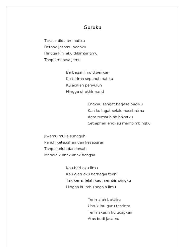 Oh guruku Kau memang pahlawan Walaupun tanpa tanda jasa Kau tetap mengajar kan kami Demi masa depan kami untuk bangsa negara kami Oh terima kasih guruku. Jasa yang telah diberikan oleh guru kepada kita sangat besar. Puisi Guru Bahasa Inggris II.