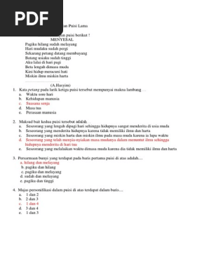 Bantu jawab dan dapatkan poin. 1 Lihat jawaban Le pale pale pap pale pale ooooo. Puisi berikut untuk soal nomor 1-3 alamku ini awan bergerak seiring waktuku yang kering kerontang angin berdiri menepi sejenak beri kesejukan kuda berlari terkikik tinggal jejak kaki di antara rumputan misteri alamku ini memang begini dapat dipastikan perubahan yang terhenti Makna kias kering kerontang pada bait puisi tersebut adalah.